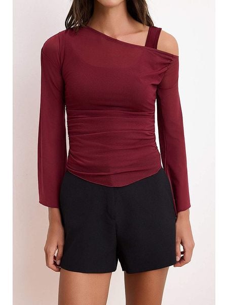 – dekolt: łódka- krój rękawów: na jedno ramię- długość rękawa: 7/8- krój: wąski- look: jednokolorowy