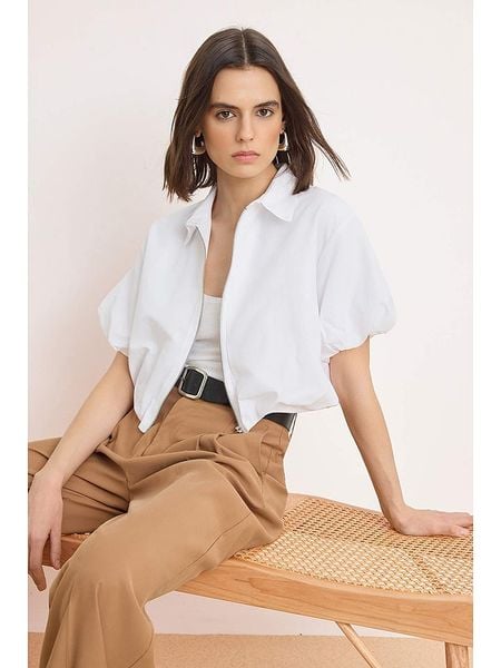 – kołnierz: kent- zapięcie: suwak- krój rękawów: bufiasty- krój: cropped- look: jednokolorowy