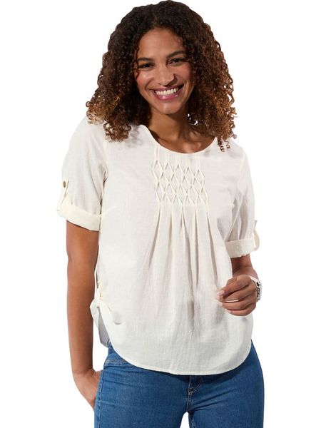 – z dodatkiem lnu- dekolt: okrągły- zakończenie rękawów: patka i guzik- dolny brzeg: zaokrąglony- detale: ozdobna zakładka- krój: prosty- look: jednokolorowy