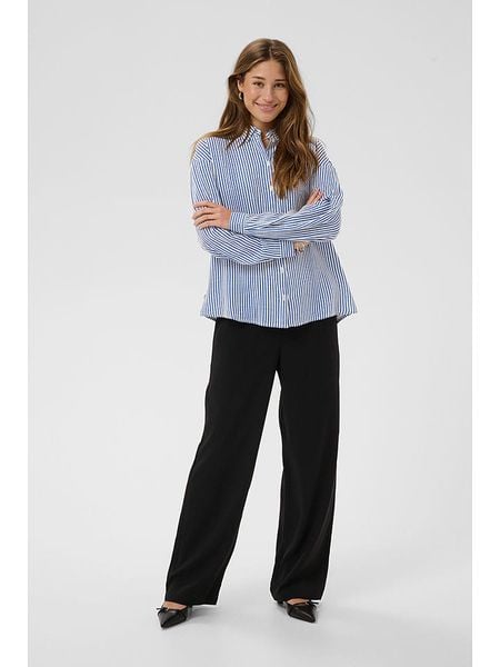 – czysta wiskoza- kołnierz: kent- zapięcie: listwa guzikowa- zakończenie rękawów: guzik- krój: prosty- wzór: paski