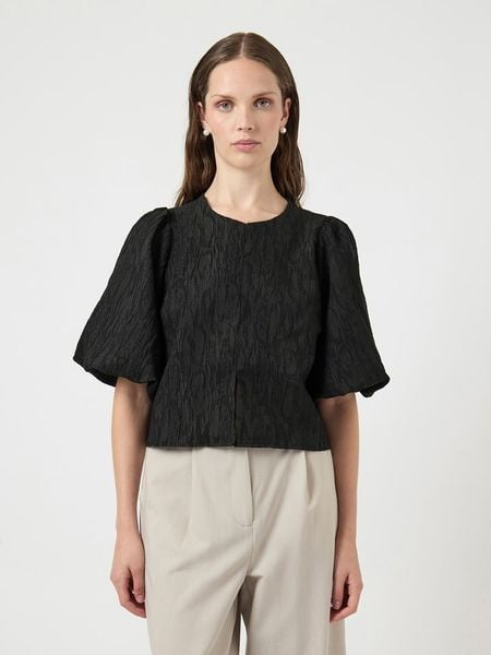 – z dodatkiem poliestru pochodzącego z recyklingu- dekolt: okrągły- krój rękawów: bufiasty- zakończenie rękawów: elastyczne- długość rękawa: półdługi- krój: prosty- look: jednokolorowy