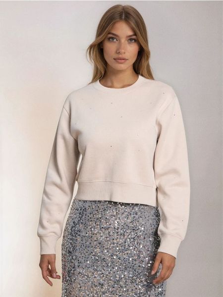 Krótka bluza crewneck z cyrkoniami – beżowy