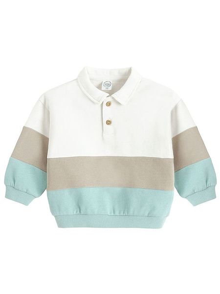 – czysta bawełna- kołnierzyk: polo- zapięcie: skrócona listwa guzikowa- ściągacz: kołnierz, zakończenia rękawów, dolny brzeg- krój: prosty- wzór: colour blocking