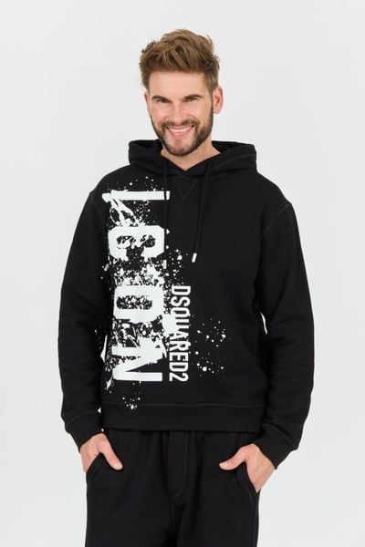 Czarna męska bluza z kapturem Icon Splash Cool Fit Hoodie, marki Dsquared2.Wymiary modela: wzrost: 190 cm, klatka: 107 cm, pas: 93 cm.Model ma na sobie produkt w rozmiarze XL.Wymiary produktu w rozmiarze XL: szerokość pod pachami: 64 cm, długość całkowita: 68 cm.