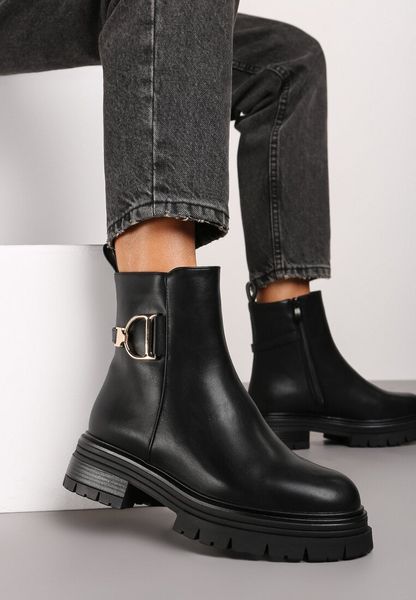 Czarne Botki Sztyblety na Płaskiej Podeszwie Ozdobione Klamrą Linitha