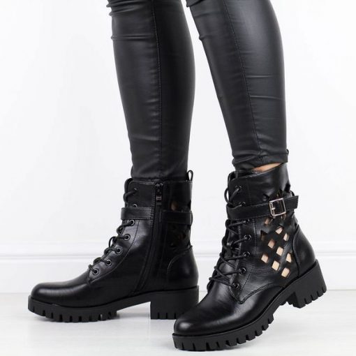 Czarne jesienne ażurowe botki damskie M.Daszyński 1813-33a Gruby Spód