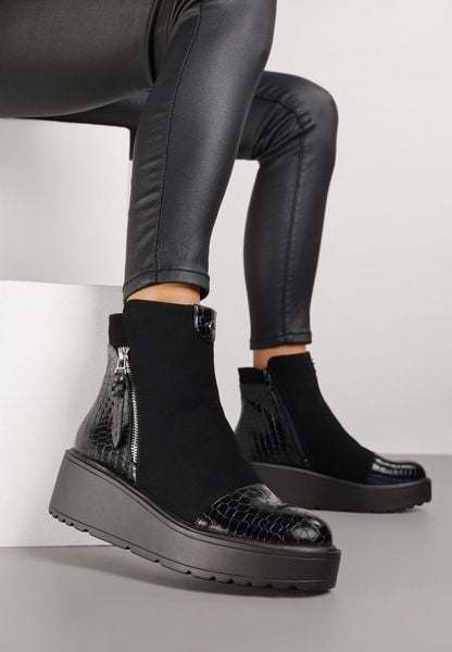Czarne Botki Vices na Platformie Ozdobione Tłoczeniem Faleressa