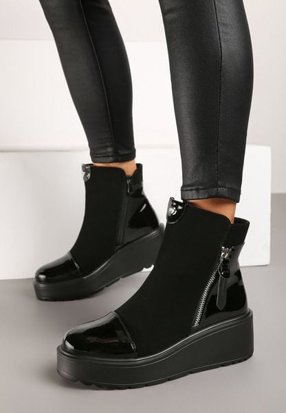Czarne Botki na Koturnie Ozdobione Suwakiem i Lakierowanymi Wstawkami Linnalia