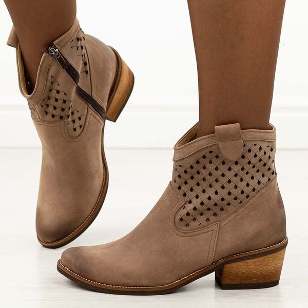 Latte skórzane Polskie botki damskie, jesienne kowbojki ażurowe na obcasie Deoni D401