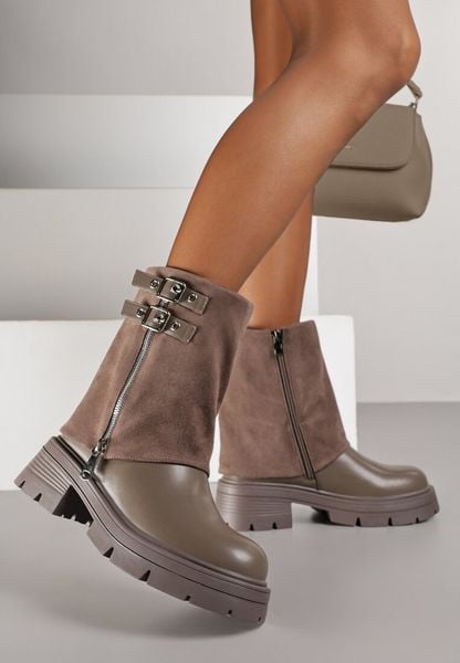 Brązowo-Szare Botki ze Skóry Naturalnej w Stylu Biker z Wywiniętą Cholewką Suwakiem i Dwiema Klamrami Adarrive