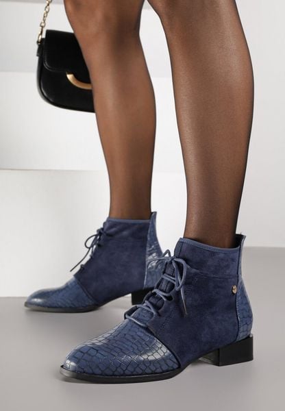 Granatowe Sznurowane Botki do Kostki Vices Zdobione Tłoczeniem Skóry Węża Wedvire