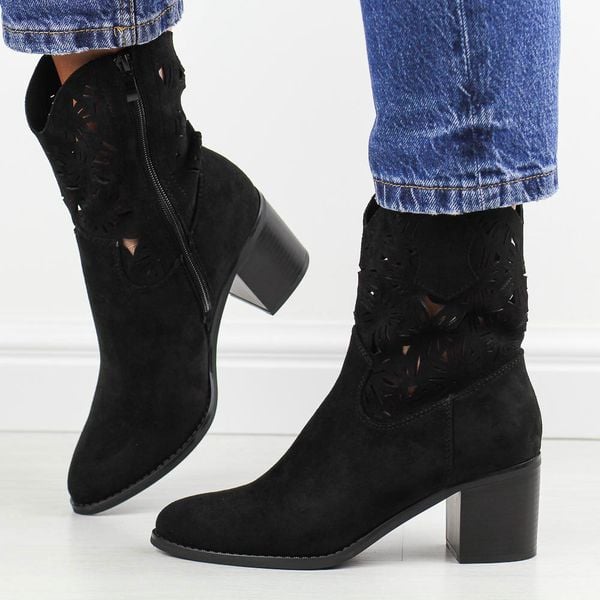 Czarne zamszowe ażurowe botki damskie na obcasie M.Daszyński 2337-12