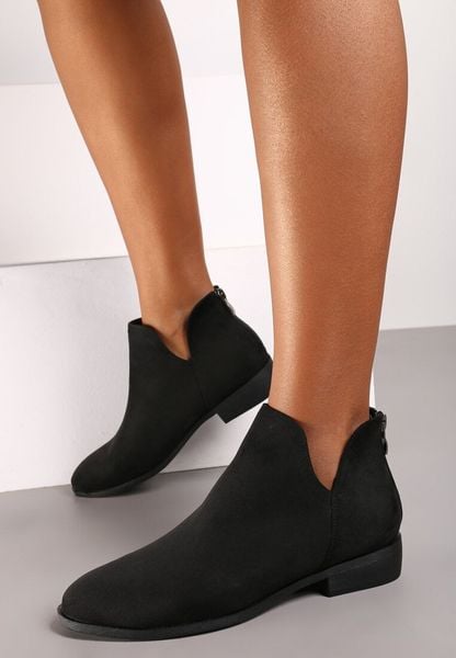 Czarne Botki na Płaskiej Podeszwie z Ozdobnym Wycięciem Zapinane na Suwak Liletta