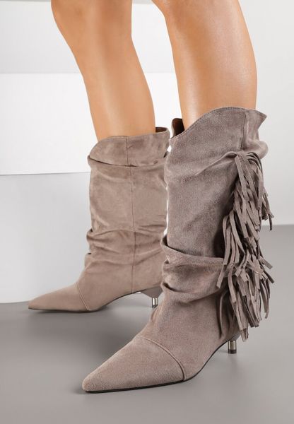 Ciemnobeżowe Marszczone Botki na Kaczuszce z Wywiniętą Cholewką z Frędzlami Fevea