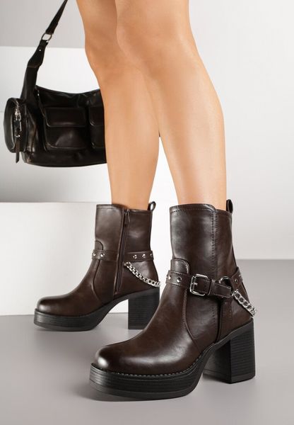 Brązowe Botki na Słupkowym Obcasie Zdobione Paskiem ze Sprzączką i Łańcuszkiem Ilvisse