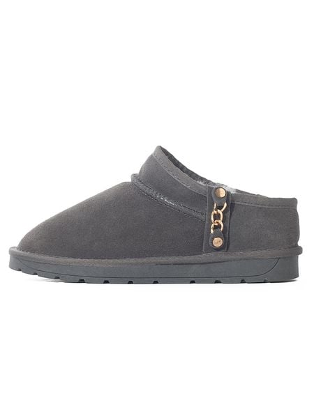 – skóra welurowa- zapięcie: bez- noski: okrągłe- wyściółka: ogrzewająca skóra owcza i materiał tekstylny- detale: dekoracyjny łańcuszek- skórzana wkładka: tak- podeszwa: antypoślizgowa