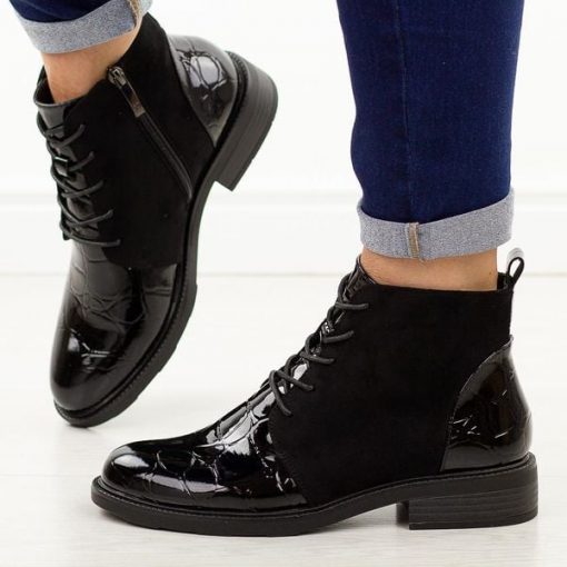 Czarne płaskie botki damskieto modne i praktyczne obuwie idealne na chłodną jesień oraz zimę. Wykonane z wysokiej jakości materiału skóropodobnego lakierowanego oraz zamszopodobnego, wyróżniają się eleganckim połyskiem i oryginalną fakturą krokodyla, która nadaje im wyjątkowego charakteru. Zapinane na suwak oraz dodatkowo sznurowane, zapewniają idealne dopasowanie do stopy i wygodę noszenia. Okrągły nosek sprawia, że buty […]