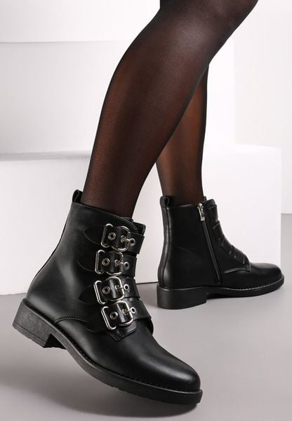 Czarne Botki z Imitacji Skóry na Płaskiej Podeszwie Ozdobione Metalową Sprzączką Legna