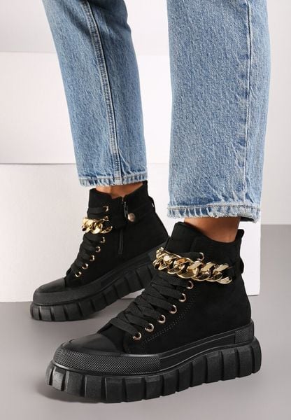 Botki Margella wykonane z ekozamszu, z wstawkami z gumy. Osadzone na grubej platformie z wycięciami. Cholewka za kostkę, zasuwana na zamek błyskawiczny z boku. Z przodu dodatkowo wiązane. Wokół kostki ozdobny odpinany pasek z łańcuchem. Nieocieplane.