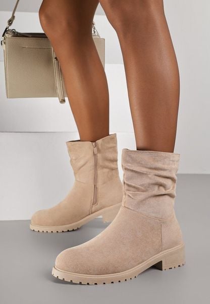 Ciemnobeżowe Botki z Imitacji Zamszu z Marszczoną Cholewką do Kostki Ilora