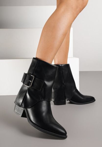 Czarne Botki Kowbojki na Stożku z Marszczoną Wywiniętą Cholewką i Klamrami Finitta