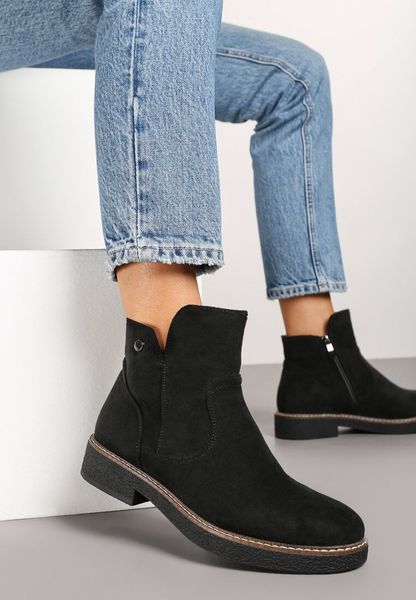 Czarne Botki na Płaskiej Podeszwie z Marszczeniami przy Cholewce z Suwakiem Raisine