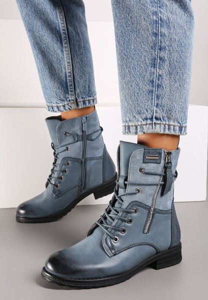 Niebieskie Botki Workery z Łączonych Materiałów z Ozdobnym Suwakiem Debiora