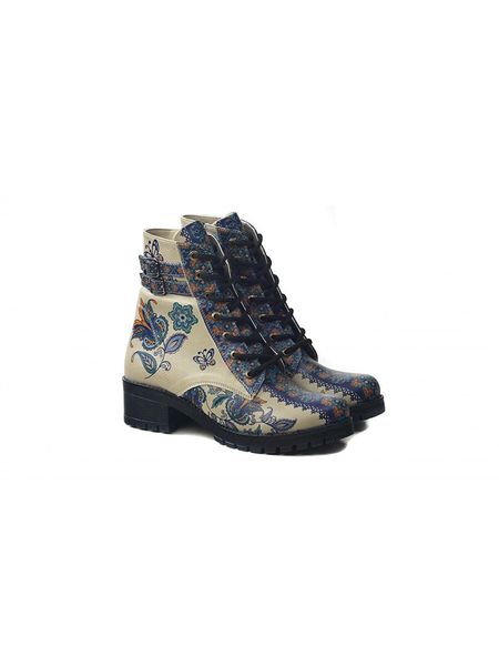– zapięcie: sznurowanie z bocznym suwakiem- noski: zaokrąglone- noski i zapiętki: wzmocnione- powierzchnia: wzorzysta- detale: ozdobna klamra- wkładka: Memory-Foam- forma obcasa: blokowy- podeszwa: antypoślizgowa