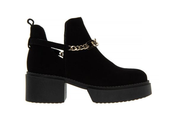 Botki marki Bayla wykonane z naturalnej skóry zamszowej w kolorze czarnym. Obuwie wsuwane na wygodnej efektownie skrojonej podeszwie. Cholewka z modnymi wycięciami po bokach przyozdobiona odpinanym paskiem ze złotym łańcuszkiem. Wkładka oraz wyściółka ze skóry naturalnej licowej zapobiegają poceniu się stóp oraz zapewniają odpowiednią cyrkulację powietrza we wnętrzu buta. Antypoślizgowa, gumowa podeszwa gwarantuje dobrą przyczepność […]