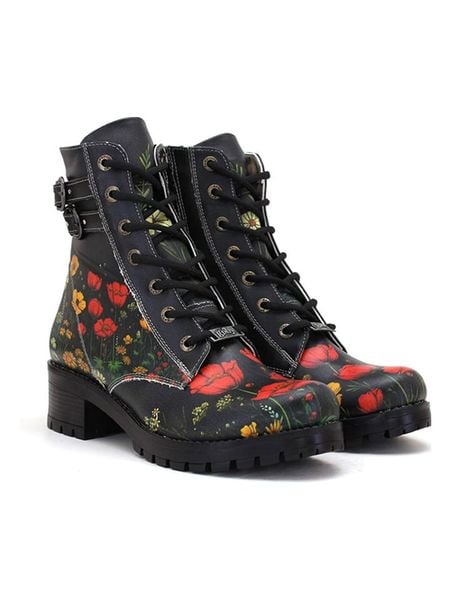 – zapięcie: sznurowanie z bocznym suwakiem- noski: zaokrąglone- noski i zapiętki: wzmocnione- powierzchnia: wzorzysta- detale: ozdobna klamra- wkładka: Memory-Foam- forma obcasa: blokowy- podeszwa: antypoślizgowa