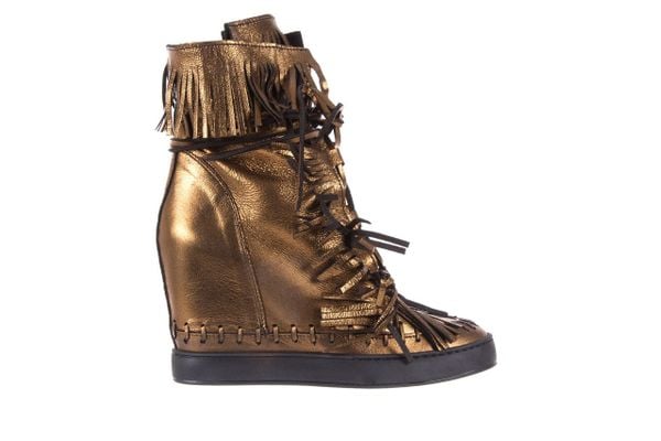 Ręcznie robione botki marki Bayla ozdobione najmodniejszymi w tym sezonie frędzlami, w metalicznym złotym odcieniu. Wyrazista ukryta koturna podwyższa sylwetkę oraz gwarantuje wygodę i stabilność podczas użytkowania. Obuwie zostało całkowicie wykonane z wysokiej jakości skóry naturalnej. Podeszwy z tworzywa odpornego na ścieranie. Buty wsuwane, wiązane rzemykiem, dzięki czemu nie posiadają zamka. Idealny wybór dla Pań […]