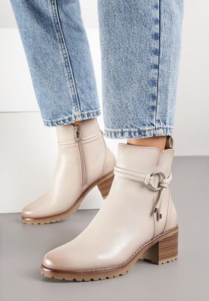 Beżowe Botki na Słupkowym Obcasie Zdobione Aplikacją Tulaviera