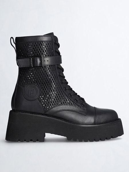 – materiał wierzchni ze skórzanymi wstawkami- zapięcie: sznurowanie z bocznym suwakiem- noski: zaokrąglone- detale: ozdobna klamra- forma obcasa: blokowy- podeszwa: profilowana