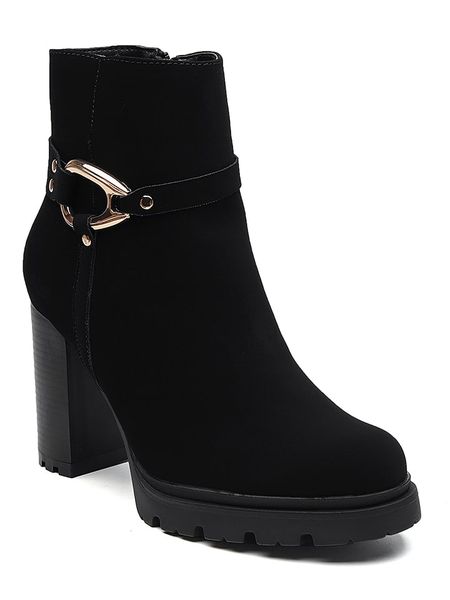– zapięcie: suwak- praktyczna szlufka ułatwiająca zakładanie- noski: zaokrąglone- detale: ozdobna klamra i pasek- forma obcasa: blokowy- podeszwa: lekko profilowana