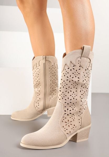 Ciemnobeżowe Ażurowe Botki na Obcasie w Stylu Kowbojek Lissemi