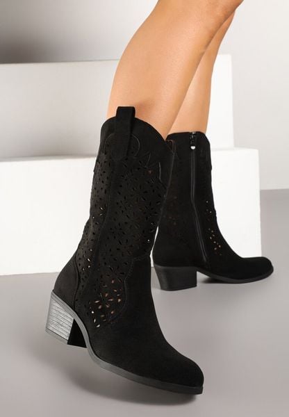 Czarne Botki Kowbojki na Słupku z Ażurową Cholewką Ravsemi