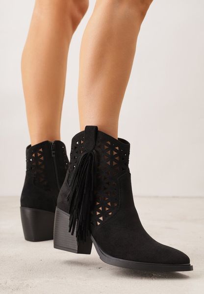 Czarne Ażurowe Botki Typu Kowbojki na Stożku Ozdobione Frędzlami Pentora