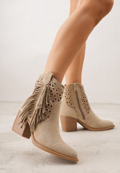 Ciemnobeżowe Botki Kowbojki na Stożkowym Obcasie z Ażurowym Wzorem i Eathetina
