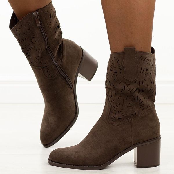 D.Brązowe zamszowe ażurowe botki damskie na obcasie M.Daszyński 2337-12