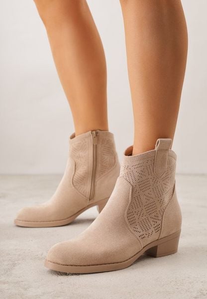 Ciemnobeżowe Botki Vices na Obcasie w Stylu Kowbojek Ozdobione Ażurowym Wzorem Zelori