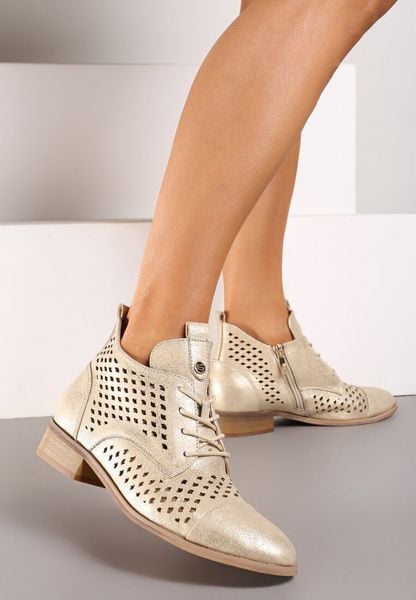 Złote Płaskie Botki z Ażurowym Zdobieniem Skórzaną Wkładką i Sznurowaniem Jagelia