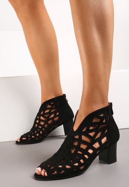 Czarne Botki na Słupku ze Skórzaną Wkładką z Ażurową Cholewką i Otwartym Noskiem Noobiria