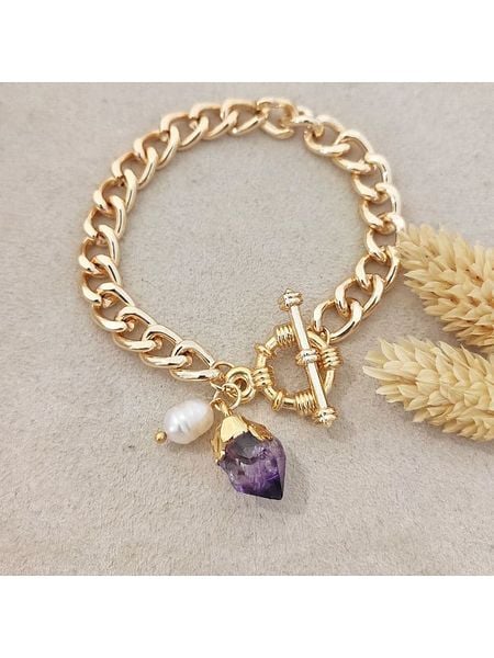 – materiał: mosiądz- powłoka: złoto- typ łańcuszka: ankier- zapięcie: kneblowe- rodzaj kamienia: ametyst- kolor kamienia: fioletowy- rodzaj perły: syntetyczna perła ozdobnaWskazówka: Zdjęcie produktu w powiększeniu.