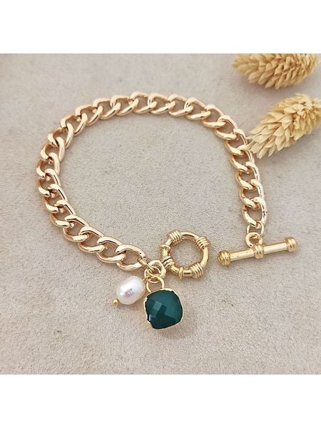– materiał: mosiądz- powłoka: złoto- typ łańcuszka: ankier- zapięcie: kneblowe- rodzaj kamienia: kryształ- kolor kamienia: zielony- rodzaj perły: syntetyczna perła ozdobnaWskazówka: Zdjęcie produktu w powiększeniu.