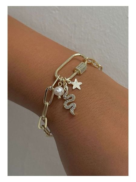 – materiał: mosiądz- powłoka: w kolorze złota- zapięcie: karabińczyk- typ łańcuszka: płaski ankier- rodzaj kamienia: cyrkonia- kolor kamienia: bezbarwny- rodzaj perły: syntetyczna perła ozdobna- kolor pereł: biały- regulacja długości: takWskazówka: Zdjęcie produktu w powiększeniu.