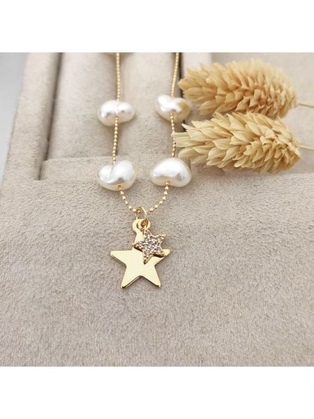 – materiał: mosiądz- powłoka: złoto- zapięcie: karabińczyk- rodzaj perły: syntetyczna perła ozdobna- regulacja długości: tak- kształt zawieszki: gwiazdaWskazówka: Zdjęcie produktu w powiększeniu.
