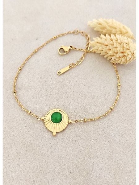 – materiał: stal szlachetna- powłoka: złoto- typ łańcuszka: ankier- zapięcie: karabińczyk- rodzaj kamienia: agat- kolor kamienia: zielony- regulacja długości: takWskazówka: Zdjęcie produktu w powiększeniu.