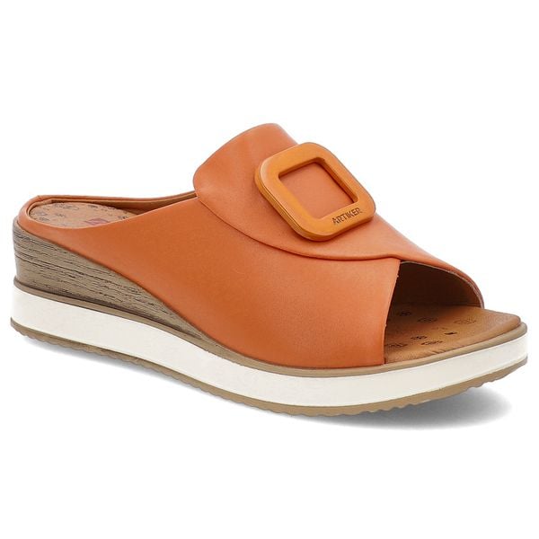 Klapki damskie Artiker, skórzane z broszką na koturnie z wygodnymi wkładkami, pomarańczowe, 56C2149