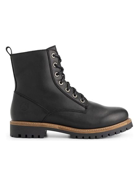 – wodoodporny materiał wierzchni- zapięcie: sznurowanie z bocznym suwakiem- praktyczna szlufka ułatwiająca zakładanie- noski: zaokrąglone- noski i zapiętki: wzmocnione- wyściółka: ogrzewająca wełna- forma obcasa: męski- podeszwa: antypoślizgowa