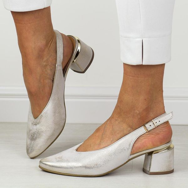 Złote skórzane Polskie czółenka damskie na obcasie bez pięty Deoni D1450A